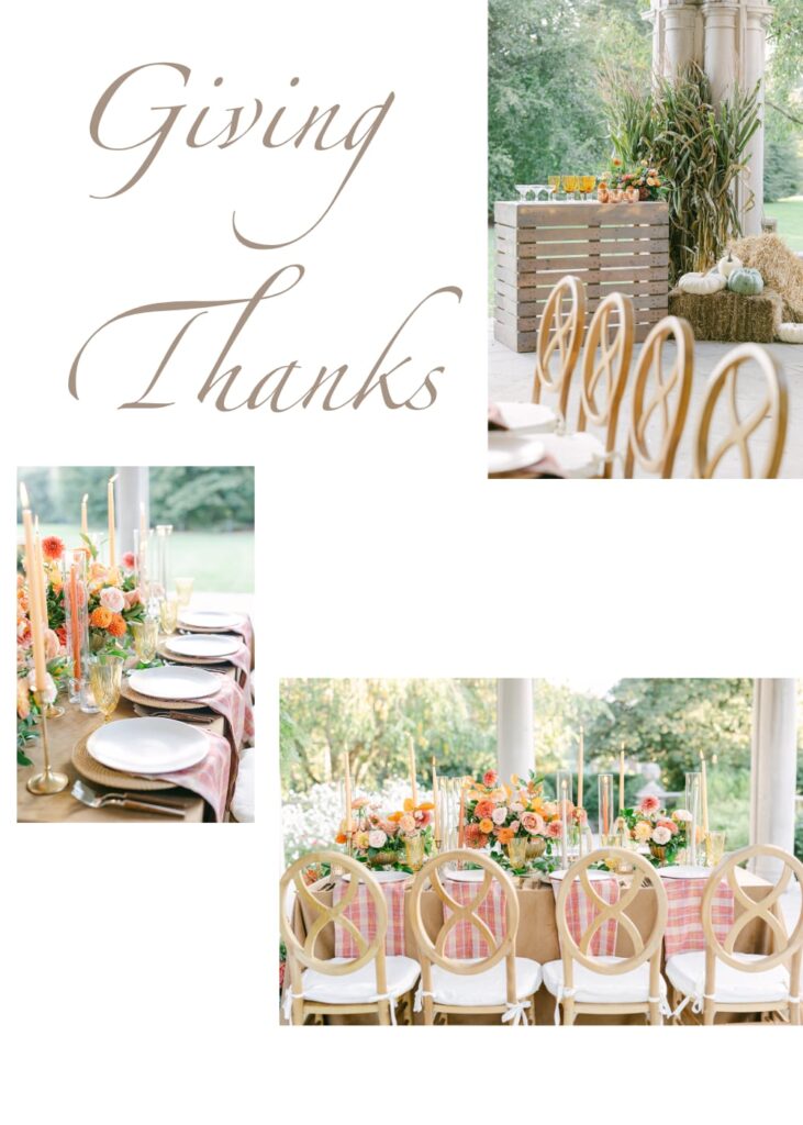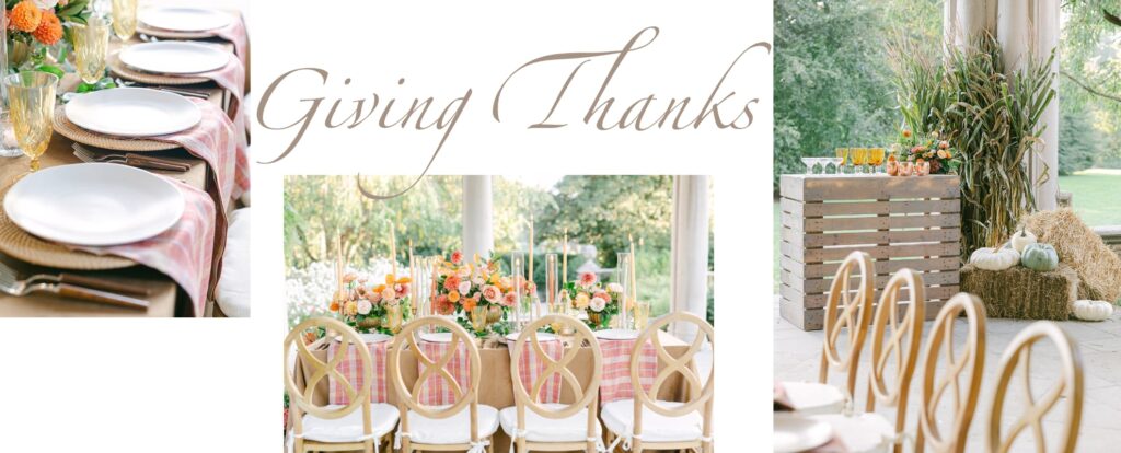 Get this cozy fall look: Nougat ibiza linens, spice Ibiza napkins, bennet mango wood chargers, heirloom linen china, smoke aurora glassware, Parker gold flatware + bentwood chairs
